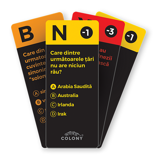 Jucătorii vor folosi aceste cartonașe pentru a da răspunsul pe care ei îl consideră corect în fiecare rundă de întrebări, iar pionii vor fi folosiți pe tabla de joc.