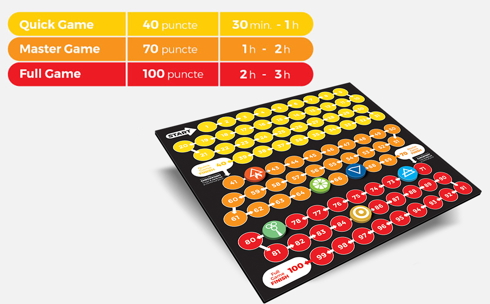 **Timpii de joc menționați în tabel sunt strict orientativi și pot să varieze în funcție de numărul de jucători, dar și de vocabularul, cunoștințele și experiența acestora.