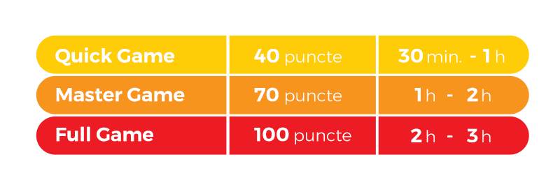Diferența dintre cele 3 constă în punctajul pe care jucătorii trebuie să îl adune ca să câștige. Timpul de joc variază în funcție de jocul ales.